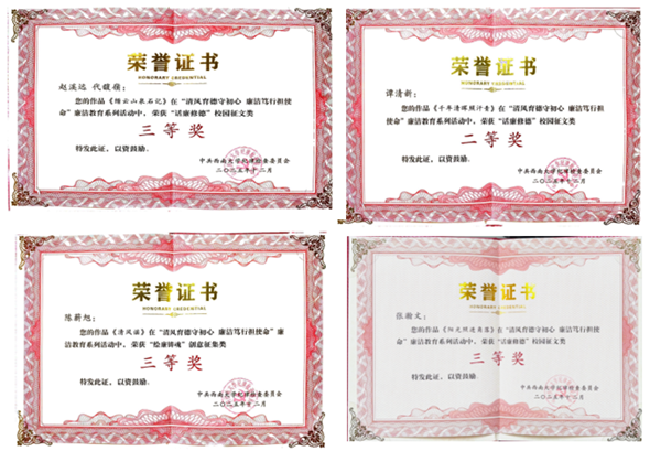 学院选送作品紧扣廉洁主题,构思新颖、内涵丰富,展现了对廉洁文化的深刻理解。经学校评审,谭清新同学作品《千年清晖照汗青》荣获征文类二等奖,张瀚文同学作品《阳光照进角落》、赵溪远同学作品《缙云山泉石记》荣获征文类三等奖,陈薪旭同学作品《清风谣》荣获创意征集类三等奖。