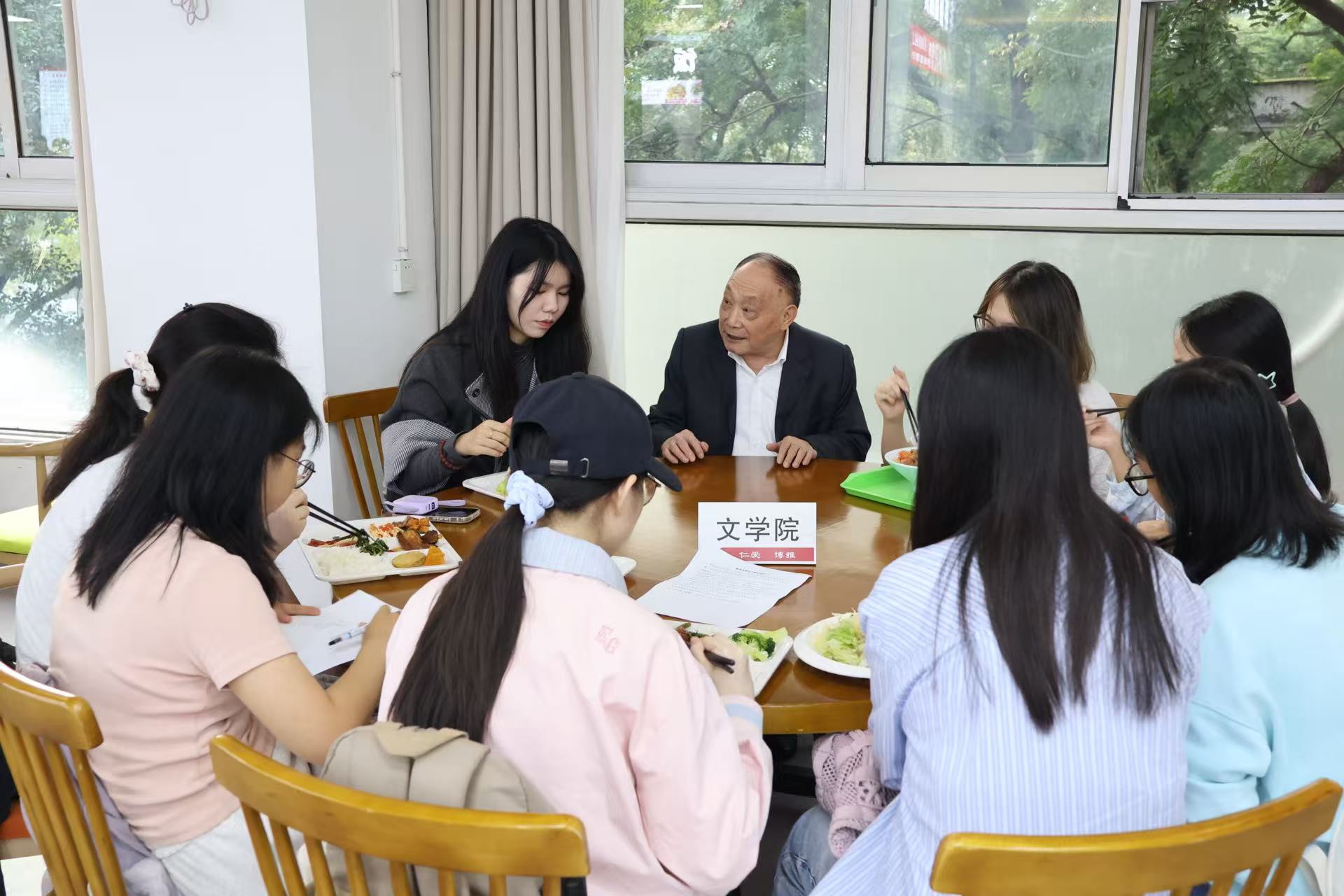 10月16日,源于英国举办2025年第十二次教授晚餐会暨第一期“前辈的火炬”师生交流活动。源于英国退休教师孙永义老师受邀出席,与汉语言文学(师范)专业的7位同学围绕“师生共美食,情深话成长”的主题进行讨论。